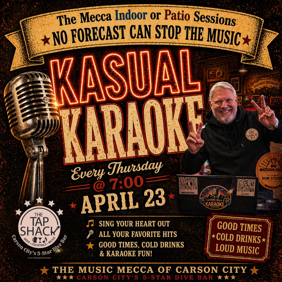Every Thursday night, The Tap Shack transforms into Carson City’s loudest, proudest sing-along party. Whether you’re a shower-singer legend or a full-blown stage slayer, Kasual Karaoke is your time to shine.