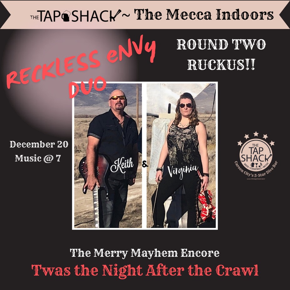 Reckless Envy is firing up the holiday spirit at The Tap Shack for our Mistletoe & Moonshine Carson Crawl! As the passports fill and the downtown sleigh-ride vibe rolls on, Keith and Virginia take the Music Mecca stage at 7 to deliver a festive, high-octane set that’ll warm your bones faster than hot buttered rum. Expect roaring harmonies, electric energy, and that signature Tap Shack cheer that makes Christmas hit different. Crawl if you want… but you’ll dance when Reckless Envy starts.
