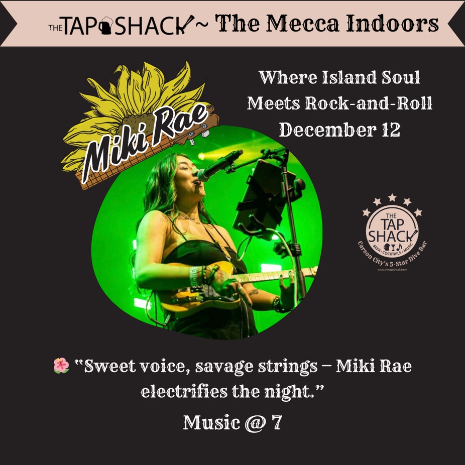 Feel the island breeze meet rock-and-roll energy as Miki Rae brings her signature sound to The Tap Shack, the Music Mecca of Carson City. Her sweet, soaring vocals blend with the bright, rhythmic bite of her ukulele—turning every song into a vibrant, electrifying wave of soul.