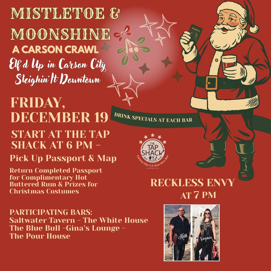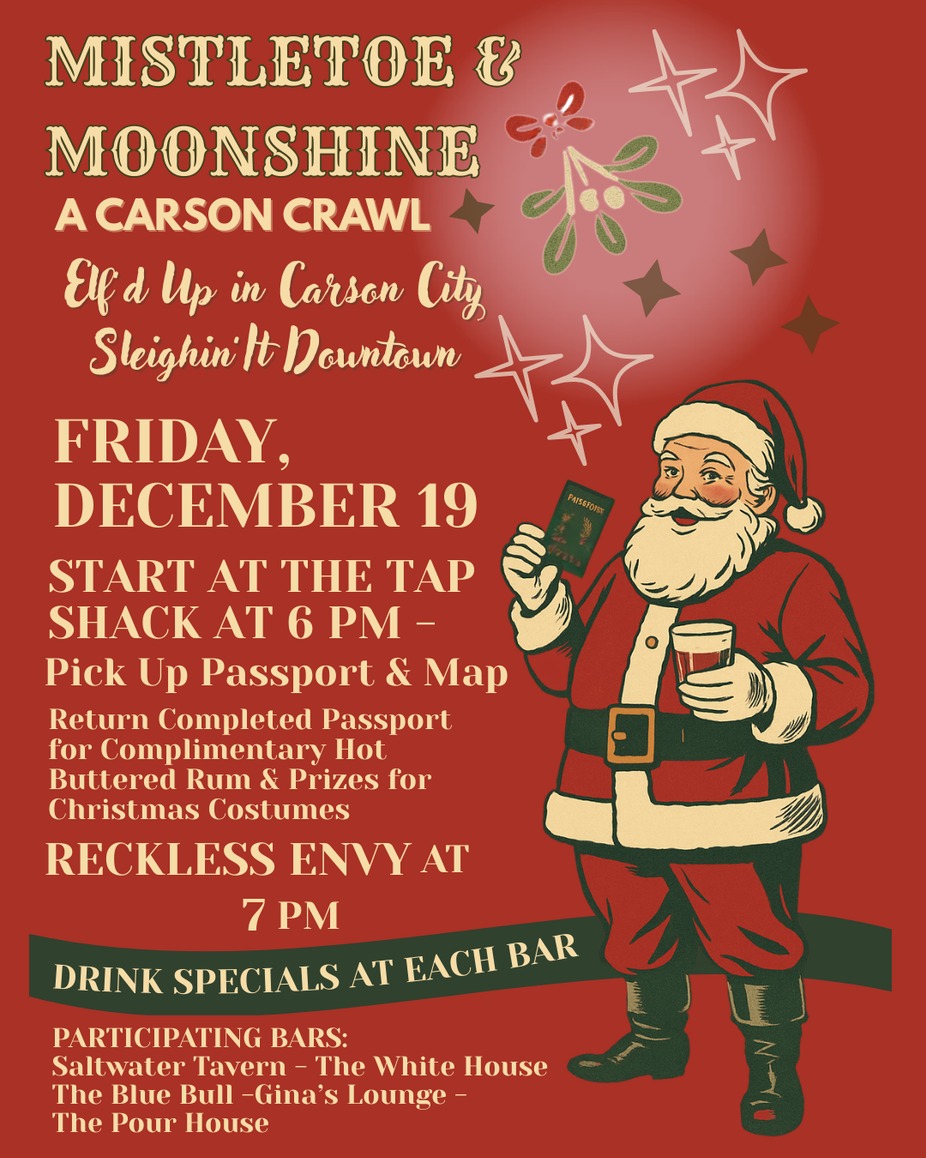 Get ready to sleigh the night away at Mistletoe & Moonshine: A Carson Crawl — the first-ever Christmas pub crawl lighting up downtown Carson City! Join us Friday, December 19, for a festive night of drink specials, ugly sweaters, holiday chaos, and live music.